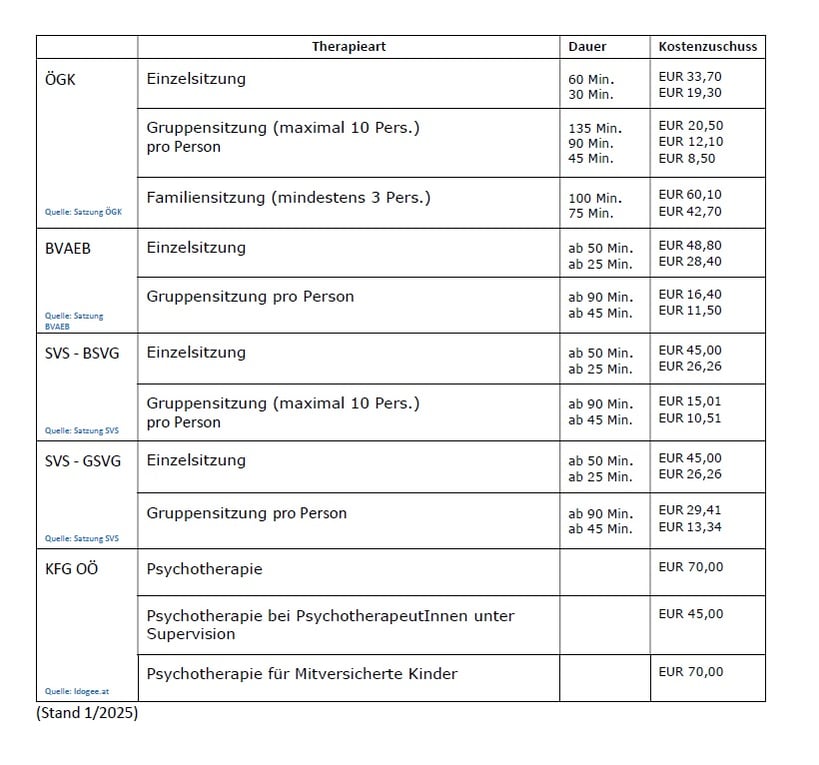 Die Psychotherapie ist privat zu bezahlen. Beinahe jede private Krankenversicherung retourniert die Kosten für die psychotherapeutische Behandlung, sofern dies vertraglich vereinbart ist. Die